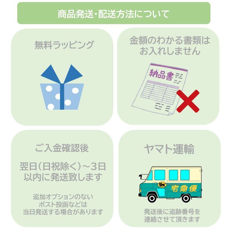 ご入金が確認できました翌日(日祝除く)~3日以内に発送致します。