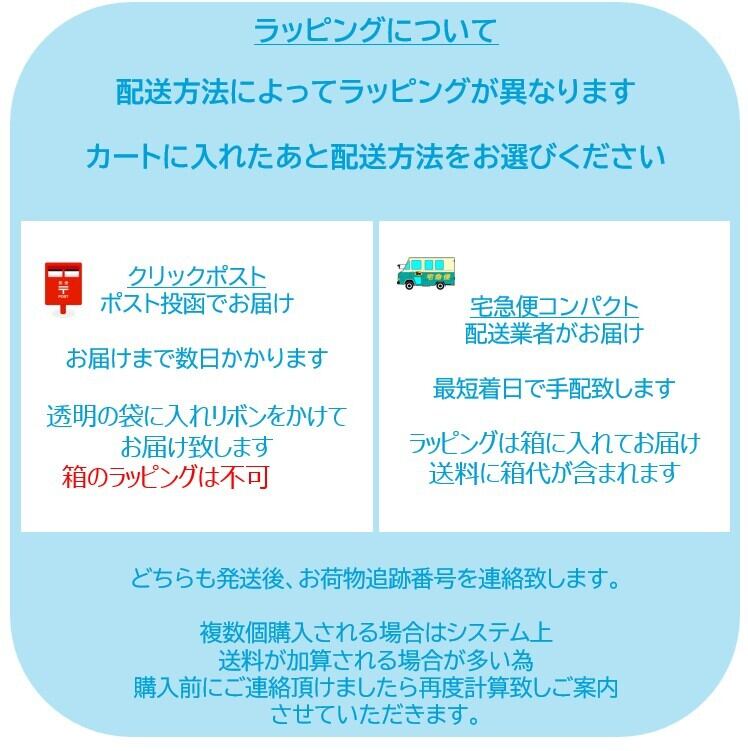 ・複数個購入される場合やまとめてラッピングの場合は、ご購入前にご連絡ください。送料を計算させて頂きます。